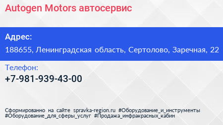 Autogen Motors, автосервис по адресу 188655, Ленинградская область, Сертолово, Заречная, 22 в дальнейшем Организация, размещена в следующих категориях: