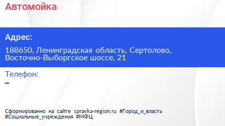 Автомойка по адресу 188650, Ленинградская область, Сертолово, Восточно-Выборгское шоссе, 21 в дальнейшем Организация, размещена в следующих категориях: