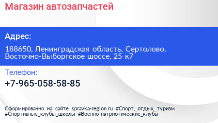 Магазин автозапчастей по адресу 188650, Ленинградская область, Сертолово, Восточно-Выборгское шоссе, 25 к7 в дальнейшем Организация, размещена в следующих категориях: