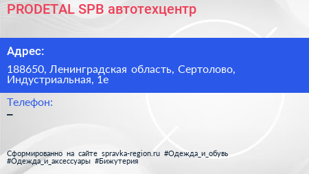 PRODETAL SPB, автотехцентр по адресу 188650, Ленинградская область, Сертолово, Индустриальная, 1е в дальнейшем Организация, размещена в следующих категориях: