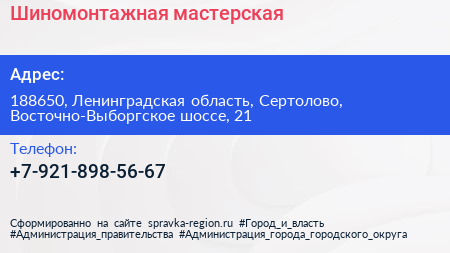 Шиномонтажная мастерская по адресу 188650, Ленинградская область, Сертолово, Восточно-Выборгское шоссе, 21 в дальнейшем Организация, размещена в следующих категориях: