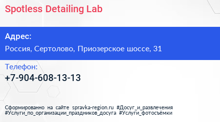 Spotless Detailing Lab по адресу 31, Приозерское шоссе, Лупполово, Юкковское сельское поселение, Всеволожский район, Ленинградская область, Северо-Западный федеральный округ, 188652, Россия в дальнейшем Организация, размещена в следующих категориях: