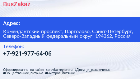 BusZakaz по адресу Комендантский проспект, Парголово, Санкт-Петербург, Северо-Западный федеральный округ, 194362, Россия в дальнейшем Организация, размещена в следующих категориях: