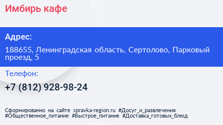 Имбирь, кафе по адресу 188655, Ленинградская область, Сертолово, Парковый проезд, 5 в дальнейшем Организация, размещена в следующих категориях: