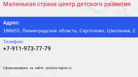 Маленькая страна, центр детского развития по адресу 188655, Ленинградская область, Сертолово, Школьная, 2 в дальнейшем Организация, размещена в следующих категориях: