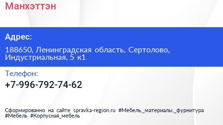 Манхэттэн по адресу 188650, Ленинградская область, Сертолово, Индустриальная, 5 к1 в дальнейшем Организация, размещена в следующих категориях: