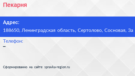 Пекарня по адресу 188650, Ленинградская область, Сертолово, Сосновая, 3а в дальнейшем Организация, размещена в следующих категориях: