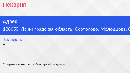 Пекарня по адресу 188650, Ленинградская область, Сертолово, Молодцова, 8 в дальнейшем Организация, размещена в следующих категориях: