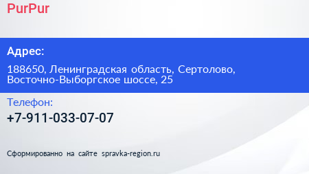 PurPur по адресу 188650, Ленинградская область, Сертолово, Восточно-Выборгское шоссе, 25 в дальнейшем Организация, размещена в следующих категориях: