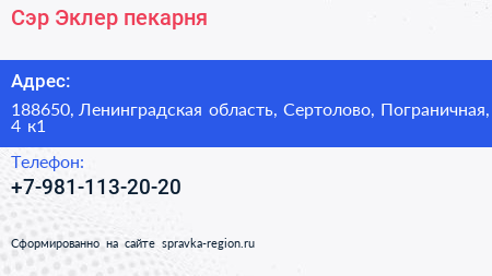 Сэр Эклер, пекарня по адресу 188650, Ленинградская область, Сертолово, Пограничная, 4 к1 в дальнейшем Организация, размещена в следующих категориях: