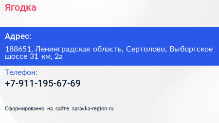 Ягодка по адресу 188651, Ленинградская область, Сертолово, Выборгское шоссе 31 км, 2а в дальнейшем Организация, размещена в следующих категориях: