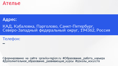 Ателье по адресу КАД, Кабаловка, Парголово, Санкт-Петербург, Северо-Западный федеральный округ, 194362, Россия в дальнейшем Организация, размещена в следующих категориях: