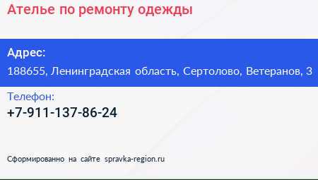 Ателье по ремонту одежды по адресу 188655, Ленинградская область, Сертолово, Ветеранов, 3 в дальнейшем Организация, размещена в следующих категориях: