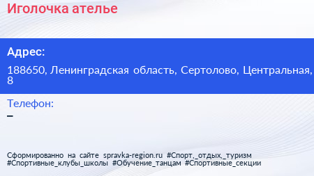 Иголочка, ателье по адресу 188650, Ленинградская область, Сертолово, Центральная, 8 в дальнейшем Организация, размещена в следующих категориях: