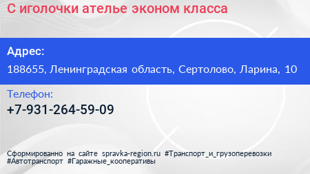 С иголочки, ателье эконом-класса по адресу 188655, Ленинградская область, Сертолово, Ларина, 10 в дальнейшем Организация, размещена в следующих категориях: