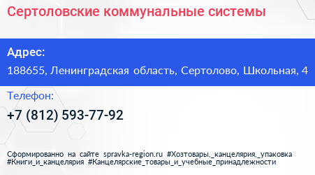 Сертоловские коммунальные системы по адресу 188655, Ленинградская область, Сертолово, Школьная, 4 в дальнейшем Организация, размещена в следующих категориях: