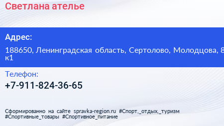 Светлана, ателье по адресу 188650, Ленинградская область, Сертолово, Молодцова, 8 к1 в дальнейшем Организация, размещена в следующих категориях: