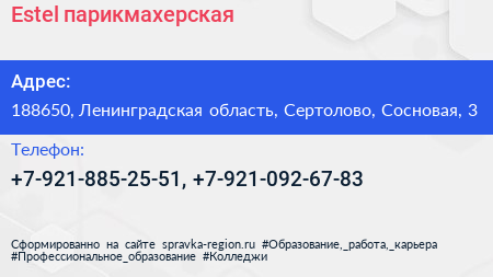 Estel, парикмахерская по адресу 188650, Ленинградская область, Сертолово, Сосновая, 3 в дальнейшем Организация, размещена в следующих категориях: