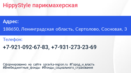 HippyStyle, парикмахерская по адресу 188650, Ленинградская область, Сертолово, Сосновая, 3 в дальнейшем Организация, размещена в следующих категориях: