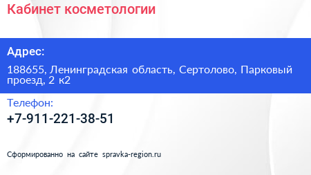 Кабинет косметологии по адресу 188655, Ленинградская область, Сертолово, Парковый проезд, 2 к2 в дальнейшем Организация, размещена в следующих категориях: