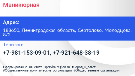 Маникюрная по адресу 188650, Ленинградская область, Сертолово, Молодцова, 8/2 в дальнейшем Организация, размещена в следующих категориях: