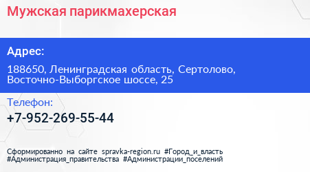 Мужская парикмахерская по адресу 188650, Ленинградская область, Сертолово, Восточно-Выборгское шоссе, 25 в дальнейшем Организация, размещена в следующих категориях:
