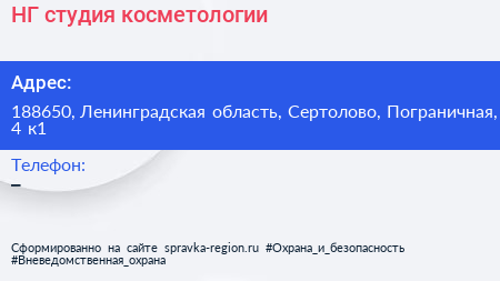 НГ, студия косметологии по адресу 188650, Ленинградская область, Сертолово, Пограничная, 4 к1 в дальнейшем Организация, размещена в следующих категориях: