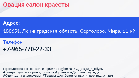 Овация, салон красоты по адресу 188651, Ленинградская область, Сертолово, Мира, 11 к9 в дальнейшем Организация, размещена в следующих категориях:
