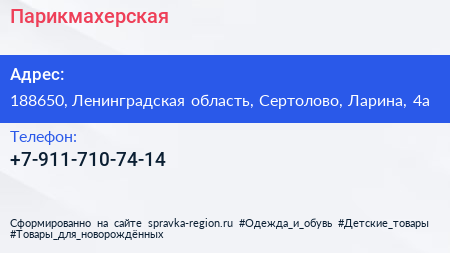 Парикмахерская по адресу 188650, Ленинградская область, Сертолово, Ларина, 4а в дальнейшем Организация, размещена в следующих категориях: