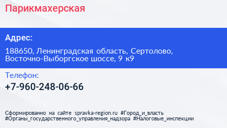 Парикмахерская по адресу 188650, Ленинградская область, Сертолово, Восточно-Выборгское шоссе, 9 к9 в дальнейшем Организация, размещена в следующих категориях: