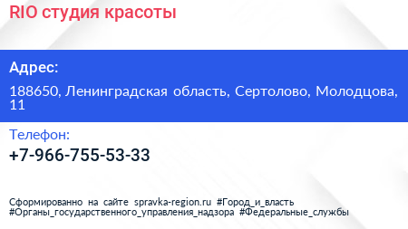 RIO, студия красоты по адресу 188650, Ленинградская область, Сертолово, Молодцова, 11 в дальнейшем Организация, размещена в следующих категориях: