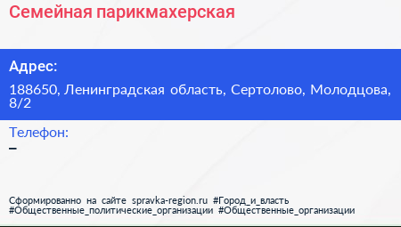 Семейная парикмахерская по адресу 188650, Ленинградская область, Сертолово, Молодцова, 8/2 в дальнейшем Организация, размещена в следующих категориях: