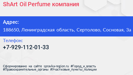 ShArt Oil Perfume, компания по адресу 188650, Ленинградская область, Сертолово, Сосновая, 3а в дальнейшем Организация, размещена в следующих категориях: