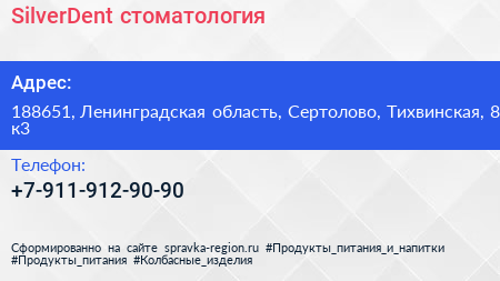 SilverDent, стоматология по адресу 188651, Ленинградская область, Сертолово, Тихвинская, 8 к3 в дальнейшем Организация, размещена в следующих категориях: