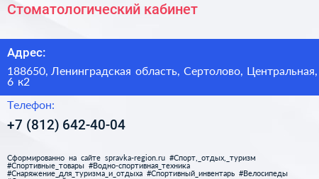 Стоматологический кабинет по адресу 188650, Ленинградская область, Сертолово, Центральная, 6 к2 в дальнейшем Организация, размещена в следующих категориях: