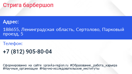 Стрига, барбершоп по адресу 188655, Ленинградская область, Сертолово, Парковый проезд, 5 в дальнейшем Организация, размещена в следующих категориях: