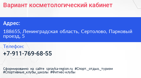 Вариант, косметологический кабинет по адресу 188655, Ленинградская область, Сертолово, Парковый проезд, 5 в дальнейшем Организация, размещена в следующих категориях:
