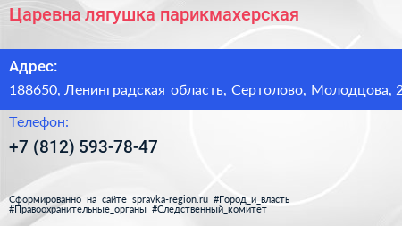 Царевна лягушка, парикмахерская по адресу 188650, Ленинградская область, Сертолово, Молодцова, 2 в дальнейшем Организация, размещена в следующих категориях: