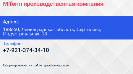 Mlform, производственная компания по адресу 188650, Ленинградская область, Сертолово, Индустриальная, 18 в дальнейшем Организация, размещена в следующих категориях: