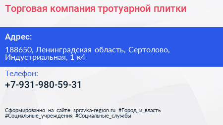 Торговая компания тротуарной плитки по адресу 188650, Ленинградская область, Сертолово, Индустриальная, 1 к4 в дальнейшем Организация, размещена в следующих категориях: