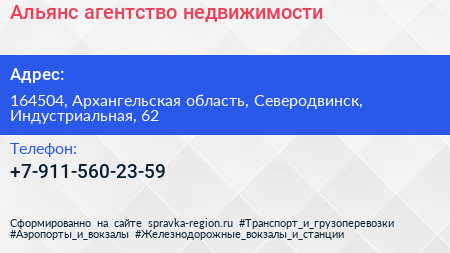 Альянс, агентство недвижимости по адресу 164504, Архангельская область, Северодвинск, Индустриальная, 62 в дальнейшем Организация, размещена в следующих категориях:
