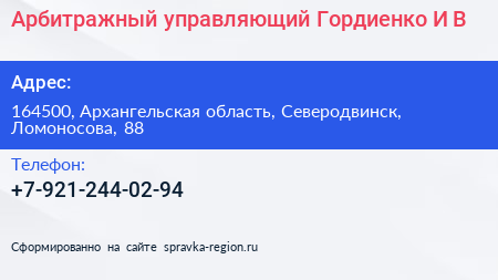Арбитражный управляющий Гордиенко И.В. по адресу 164500, Архангельская область, Северодвинск, Ломоносова, 88 в дальнейшем Организация, размещена в следующих категориях: