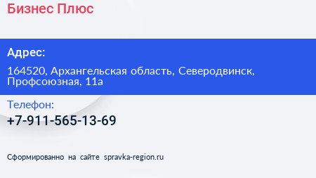 Бизнес Плюс по адресу 164520, Архангельская область, Северодвинск, Профсоюзная, 11а в дальнейшем Организация, размещена в следующих категориях: