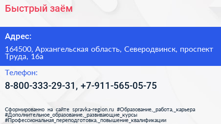 Быстрый заём по адресу 164500, Архангельская область, Северодвинск, проспект Труда, 16а в дальнейшем Организация, размещена в следующих категориях: