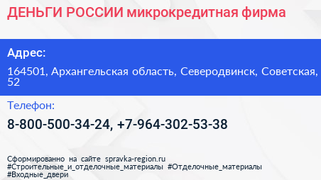 ДЕНЬГИ РОССИИ, микрокредитная фирма по адресу 164501, Архангельская область, Северодвинск, Советская, 52 в дальнейшем Организация, размещена в следующих категориях:
