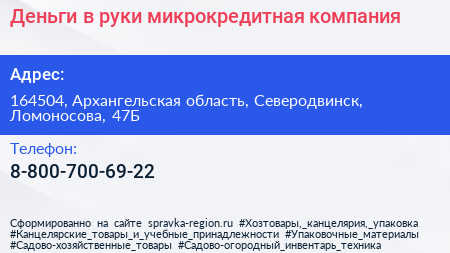 Деньги в руки, микрокредитная компания по адресу 164504, Архангельская область, Северодвинск, Ломоносова, 47Б в дальнейшем Организация, размещена в следующих категориях: