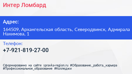 Интер-Ломбард по адресу 164509, Архангельская область, Северодвинск, Адмирала Нахимова, 1 в дальнейшем Организация, размещена в следующих категориях: