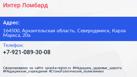 Интер-Ломбард по адресу 164500, Архангельская область, Северодвинск, Карла Маркса, 20а в дальнейшем Организация, размещена в следующих категориях: