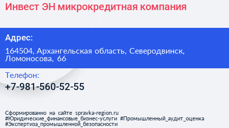 Инвест-ЭН, микрокредитная компания по адресу 164504, Архангельская область, Северодвинск, Ломоносова, 66 в дальнейшем Организация, размещена в следующих категориях: