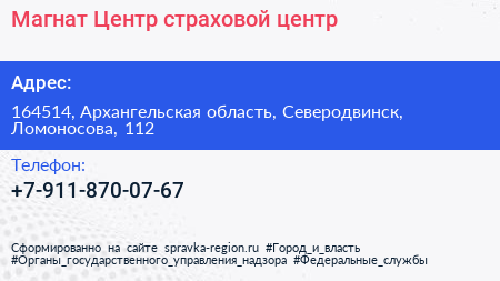 Магнат Центр, страховой центр по адресу 164514, Архангельская область, Северодвинск, Ломоносова, 112 в дальнейшем Организация, размещена в следующих категориях: